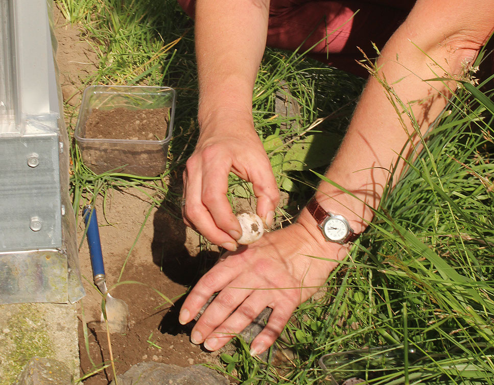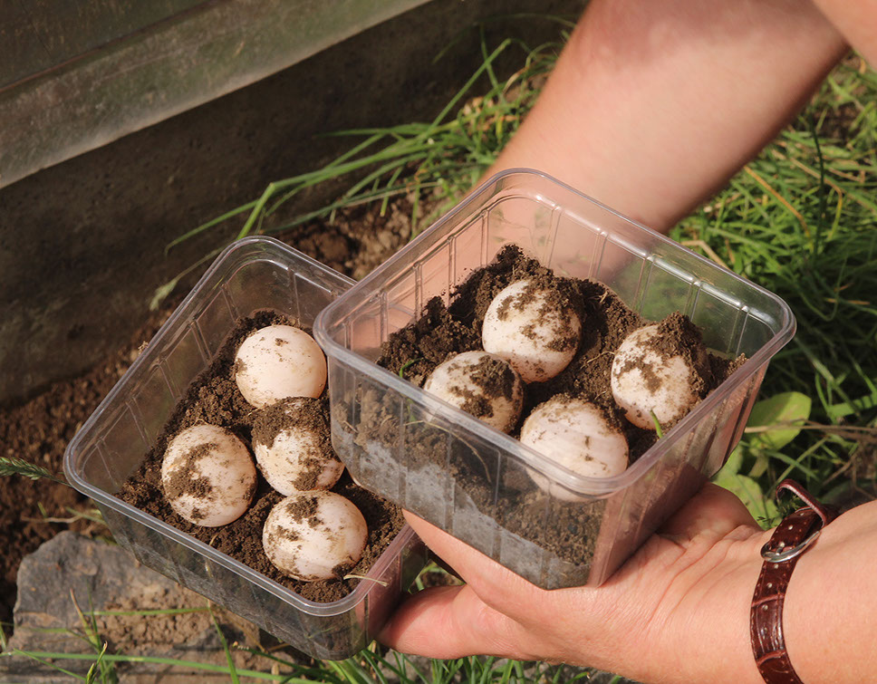 Nachdem das Weibchen das Gelege verlassen hat, werden die Eier vorsichtig ausgegraben.