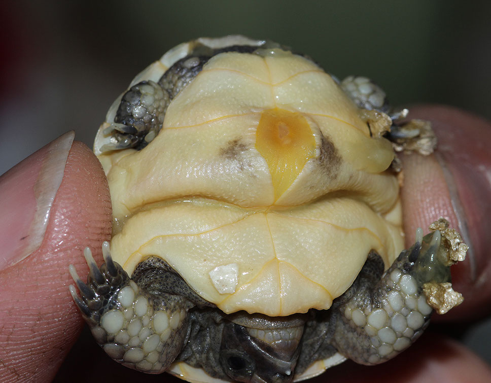 Frisch aus dem Ei - der Bauch ist noch eingeknickt. Nach ein paar Tagen ist diese Falte glatt und der Nabel (die gelbe Stelle am Bauch) wächst zu.